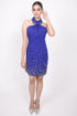 • The halter neckline with a sharp collared detail is adorned with delicate embellishments, adding a chic and slightly edgy twist.