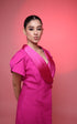 This dress is a sleek and modern short blazer dress in a bold fuchsia color. It features a structured silhouette with a tailored fit, giving it a polished and elegant look. The design includes: